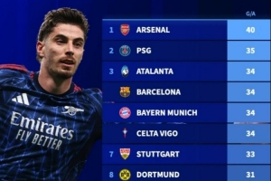 本赛季五大联赛球队替补参与进球榜:阿森纳40球领跑,巴黎次席