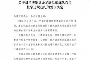 体育资讯04月08日讯 中足联官网今日公布处罚决定,中超第4轮,浙江vs重庆铜梁龙,重庆铜梁龙助理教练杜宇辱骂裁判员,禁止进入体育场6场,罚款6万元。